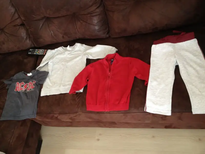 24. resim 12-18 ay hm tişört 5 tl, hm gri sweat 6 tl, kırmızı hırka amerikadan 7 tl, chicco eşofman altıhiç giyilmedi 7 tl