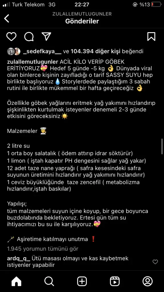 Yok hünde 3 litre su içiyorum gün içinde de hiç oturmuyorum oğlum 1 dakika bile nefes almama izn vermiyor. Karbonhidrat yesem kim bilir ne kadar kilo alırım. Ben kendimi bildim bileli diyet yapıyorum ve asla yiyerek kilo veremiyorum benim bünyenin aç kalması lazım