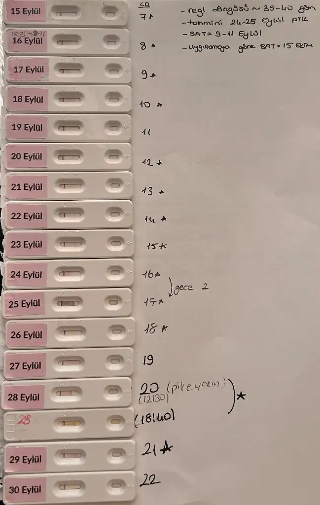 27 yaşındayım. Oldum olası Pcos var bende. Temmuz ayında bir kimyasal gebelik geçirdim. Genelde 35-40 gün arasında regl oluyorum. Ovülasyon testi denemek istedim. Görselini aşağıya iletiyorum. Genelde her gün ilişkiye giriyoruz. Yıldızladıklarım ilişki olan günler. O yüzden kaçırma ihtimalim yoktur diye düşünüyorum. Görselimi yorumlar mısınız Tam koyu T çizgisi göremedim 🥹