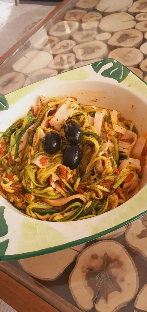 Öğlen: Hindi fümeli kabak spagettisi ( Kabakların özel bir bıçakla spagetti şeklinde kesilmesinden yapılıyor)