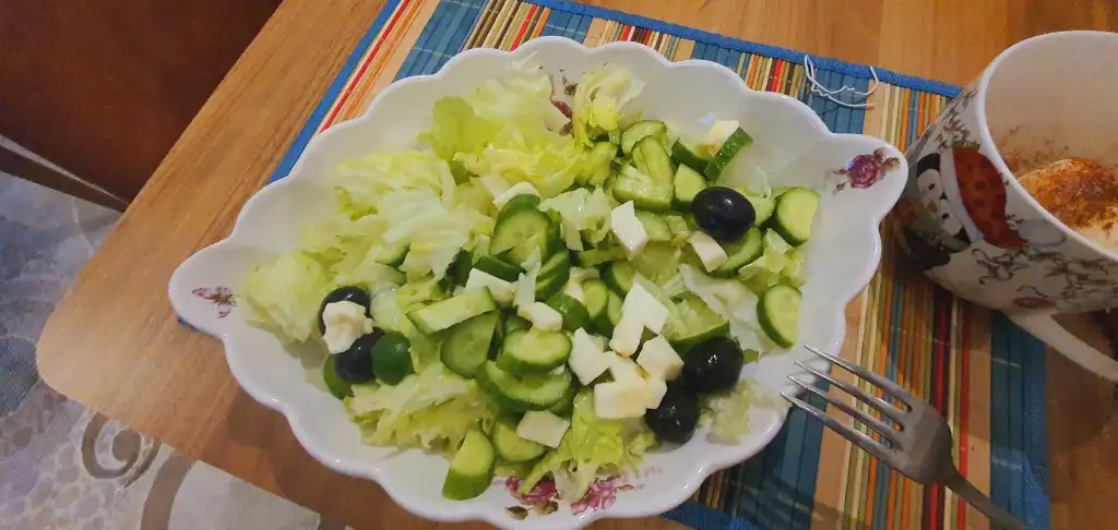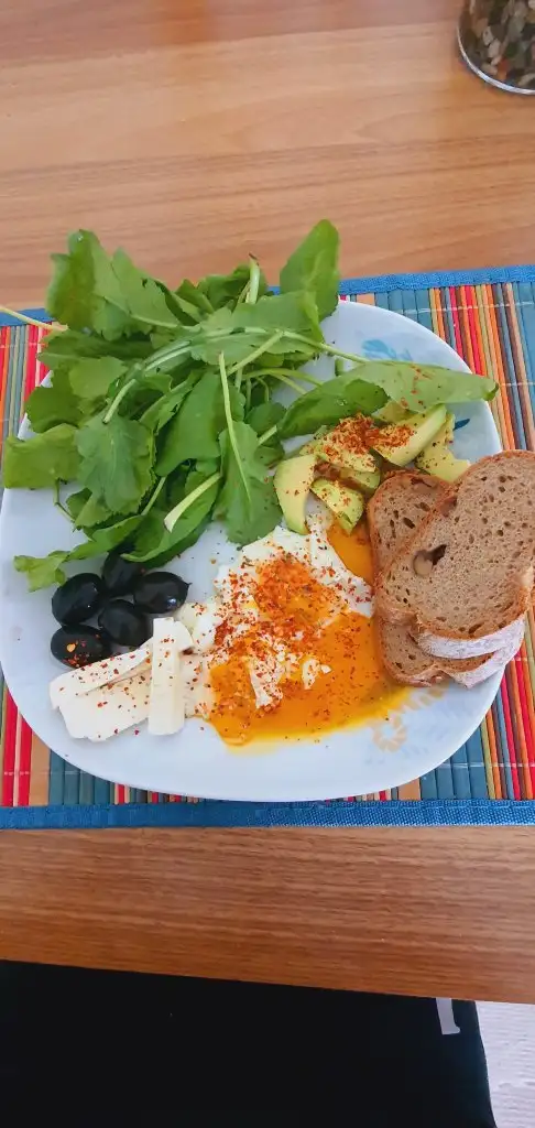 Saat 11:30 da 2 yumurta, bol yeşillik, 1 kk köy peyniri, 5 tuzsuz zeytin, 1 ekşi mayalı cevizli ekmek