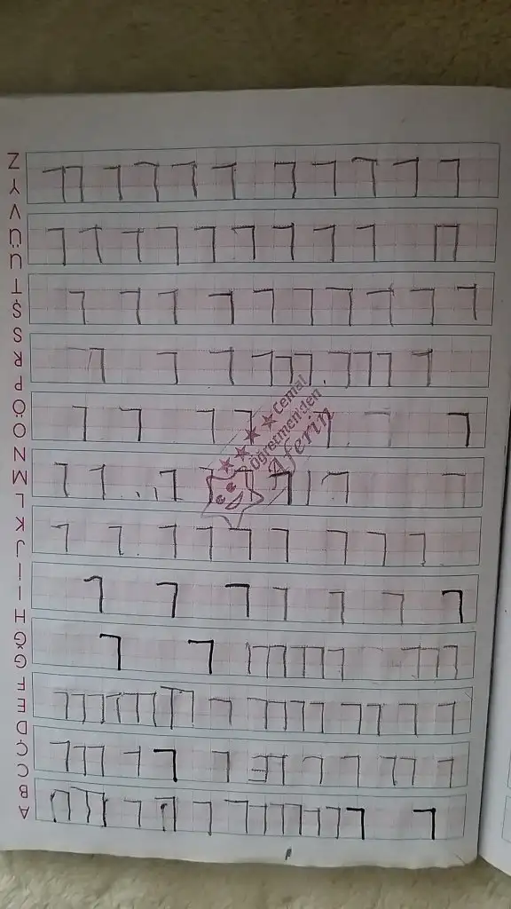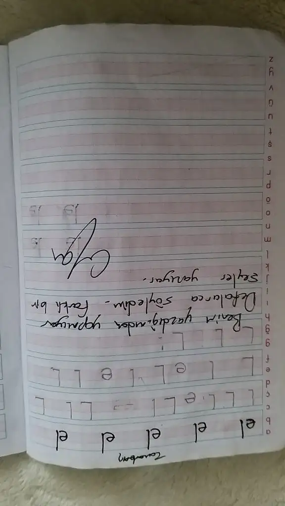 alta resim ekliycem bakın ve yorumlayın çok mu kötü. bana o kadar kötü gelmiyor harfleri ama öğretmen çok morelimi bozdu. Dün L harfine geçtiler bu gün diyo ki, el yazamamış. Hatta defterinede not düşmüş.