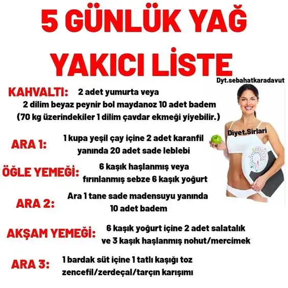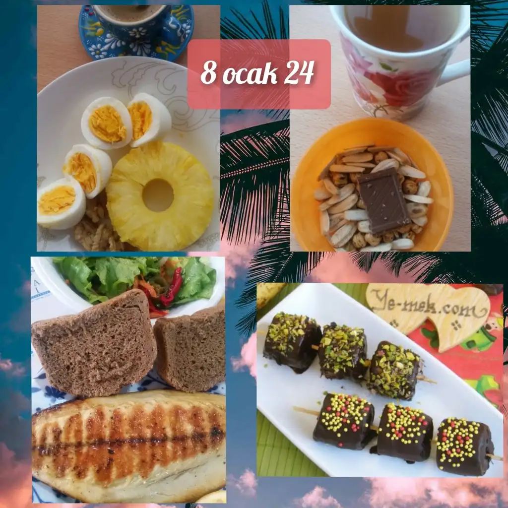 | 9:30 şekersiz mamul kurabiye büyük yyk ,hurma, kuruyemiş bar | 10:00 küçük yyk, kuru trabzon hurması, limonlu ılık su | 10:00 ceviz, yumurta, ananas, küçük türk kahvesi | 9:30 çok tahıllı ekmek üstüne margarin, vişne reçeli , 1 yumurta, peynir, limonlu maydanoz, söğüş |