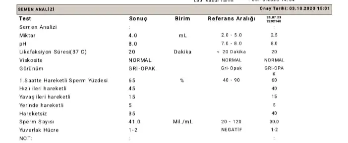 Bu testi yorumlayabilir misiniz. Mayıs ayından beri tedavi görüyor eşim. İleri hızinda sıkıntı vardı 25 di yükselme var gibi son 2 testtir ama diğer hiçbirini yorumlayamadim sizce normal yol ile gebelik mümkün mü.