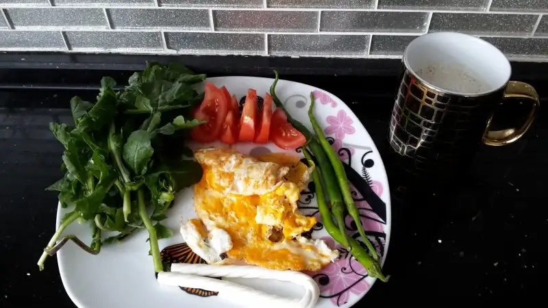 1yumurta,3 zeytin ve bir kk yarım yağlı peynir.Yarım dilim tam tah ekmek