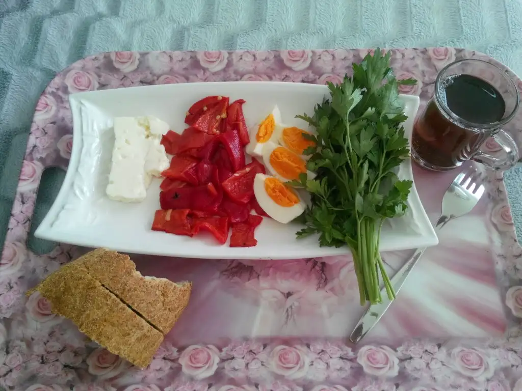 kahvaltı 1 haşlanmış yumurta, 1 közlenmiş biber, peynir, 6 zeytin, 2 dilim ekmek