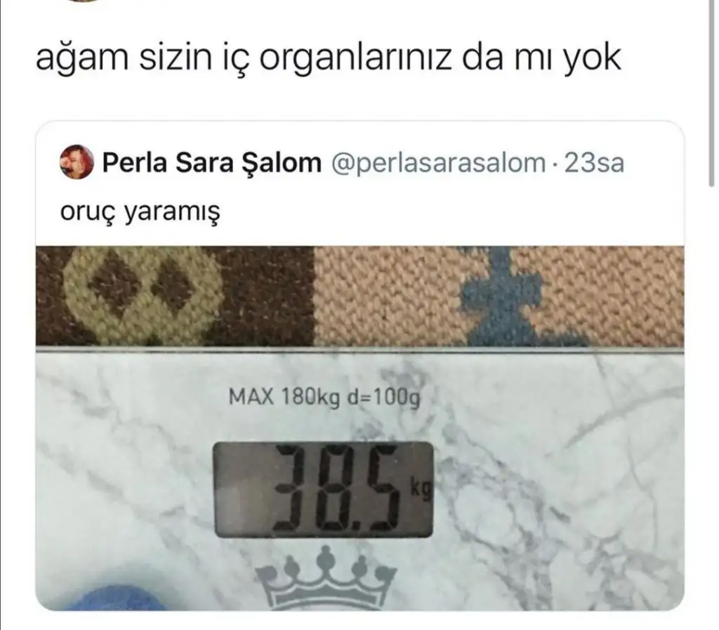 Ay ben de gördüm onu ,yarın tartı bildiriminde atsam mi dedim ama arada 40 kilo var inandirmamam ki siziNe güldüm gece gecebakın ramazanda millet ne kilolar vermiş