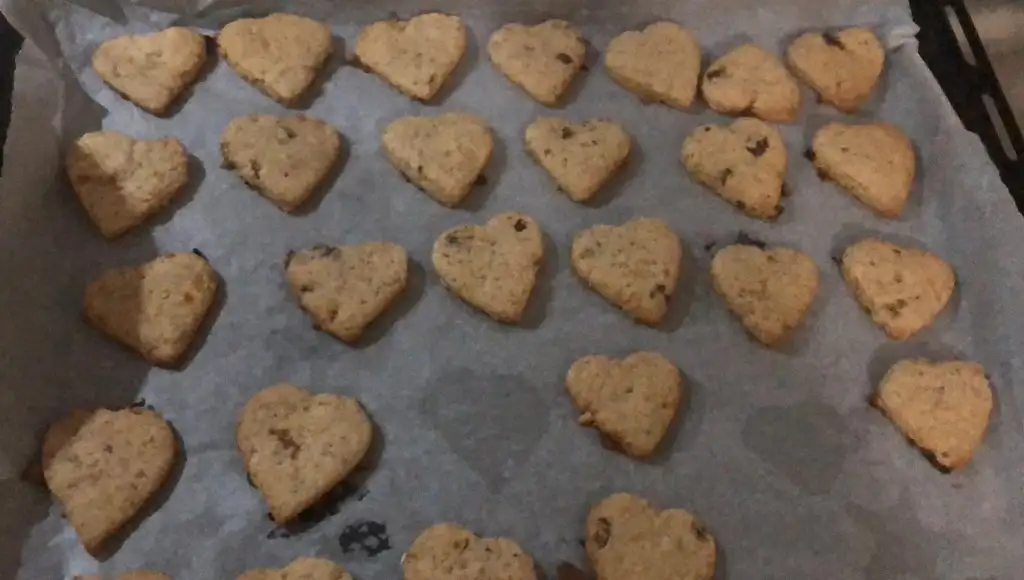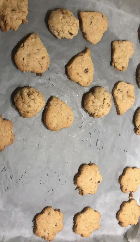 Oda sıcaklığında tereyağ (100gr) ve yumurtayı(1tane) çırptım. Göz kararı ununu ekledim. Daha sonra robottan geçirdiğim kuru meyveleri ekledim (gün kurusu, kuru kayısı, kuru üzüm, kuru incir vardı evde bunları kullandım. Bitter damla çikolata olsaydı onu da eklerdim) yine robotta ceviz badem çektim onu da dahil ettim hamura. Çok az kabartma tozu koydum. Daha sonra yağlı kağıdın arasında açıp kalıplarla şekil oluşturdum. (Bu kısım kızçe içindi normal elde yuvarlasak da olur)