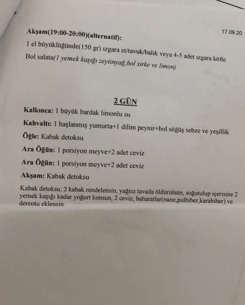 Herhangi 2 gün kabak detoksu yapıp kalan öğünlerde listedeki gibi besleniliyor.