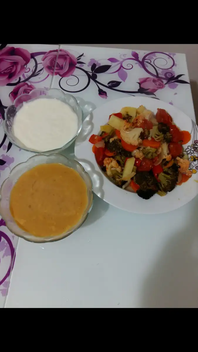 Iftar: 1 kase mercimek corbasi, 1 kase yogurt, 1 tabak firinda karisik sebze (karnibahar, brokoli, havuc, patates, kapya biber, sogan, domates)