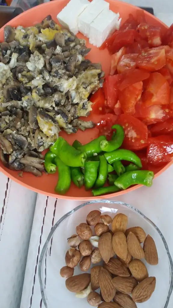 1 haşlanmış yumurta, 2 zeytin,1 domates , 2 dilim beyaz peynir