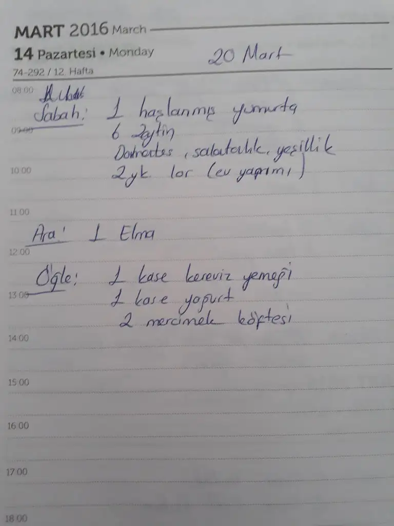 Oglen corba salata yogurt (eger kahvaltiyi gec yaptiysam 11.30-12.00 gibi oglen yemek yerine kahvalti yapiyorum sonra asagidaki gibi devam)