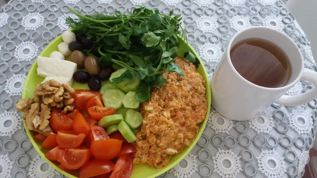 Kahvalti 2 yumurtayla menemen, 5 cerry domates, beyaz peynir, maydanoz, dereotu, 1 badem salatalik, 7 siyah zeytin, 2 yesil zeytin, 4 ceviz