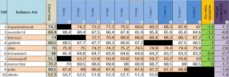 Kızlar cumadan cumaya hesaplanıyor kilo farkı bilginiz olsun. Sadece gülüm bir önceki hafta tatilde olduğu için pazartesiden cumaya hesaplandı.