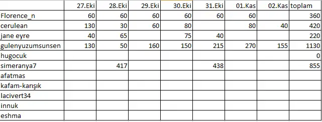 şimdi herkes günlük yaptığı sporu yazacak. yanına da toplam puanını yazacak. ben de her gün puanları tabloya ekleyeceğim. liste cuma başlar perşembe biter. cuma tekrar başlar... 1 hafta boyunca en çok puan alan kişi yeni haftaya +50 puan ile başlar. puanı yuksek olan takım da + 100 ile başlar. puanı 250 altında kalan kişi ceza alır. 1 hafta boyunca herkesin yaptığı puanı toplar. perşembe bana bildirir. eğer 250 altında kalan olmazsa bunu ben yapacağım. puan listemiz aşağıdaki şekildedir.