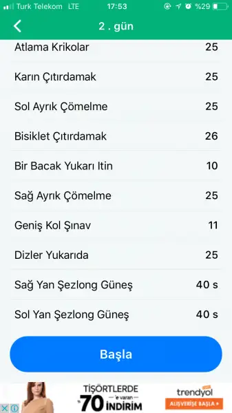Canım bunların puanlarını topla spor listesine ekle. Böyle arada kaynar. Ceza alırsın.Kızlar mesajım tam görünmemiş olabilir. Bugün tartıldım 3-4 gün içerisinde 300 gram vermişim. Sabah kahvaltıda 1 haşlanmış yumurta ara öğün tarçınlı limonlu yabanmersinli ve beyaz kurudutlu demleme su öğlen yulaf ve çia ve kinoalı haşlanmış karnıbahar. Akşam ise bir ton balıklı salata ve limonlu soda. Sporum 30 gün fit uygulamasının 2. Günü yani şöyle ekteki gibi. Bugün akşam 7ye kadar bir ara öğün yaparım. Ve akşam koşuya çıkarım. 20 aralıkta spor salonum açılacak. 20 aralığa kadar koşu ve evde spor yapıyorum. Ve evde spor için bugün mat aldım.