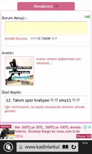 Ben de yapamadım zaar diyorum ki ben göremiyorum karşı taraf görüyor herhaldeEvet yanlış olmuş. Özel başlık kısmına yazacaksın canım.