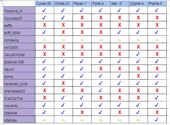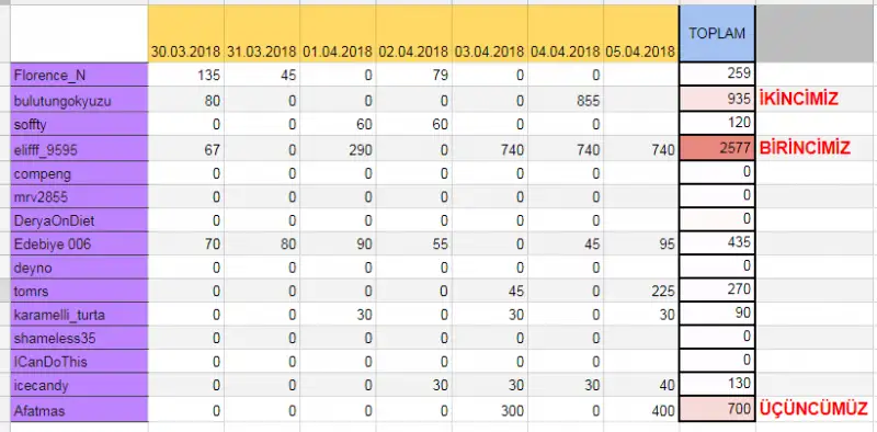 @afatmas canım devam et böyle daha yeni katıldın aramıza puanların çok iyi ama her gün yada bir gün dinlenip diğer gün yapman çok faydalı olacak kilo vermende sende bakma takımdakilere. Geldi verdi kilocukları bi çırpıda diye baksınlar arkanızdan