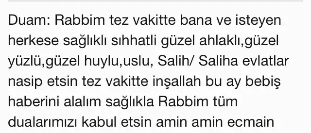 Kızlar inşallah rabbim okudumuz dualarımızı kabul etsin. Şuan çok üzgünüm. Yengem hamileymiş ilk bana haber etti. Onun adına sevindim. Kendim için üzüldüm ağlıyorum ama eşim karnım ağrıyor ondan üzülüyorum diyorum .Rabbim inşallah önümüzdeki hafta hamile olduğumun haberini almayı nasip etsin. İnşallah bende hamileyimdir. İnşallah isteyen herkes bu ay güzel haber alsın aminn aminC cansu_tr (167 adet ihlas )