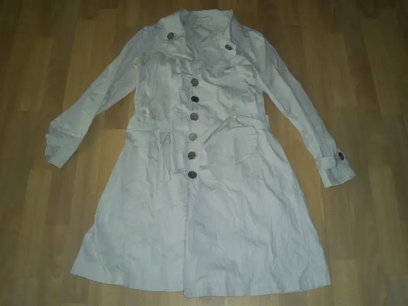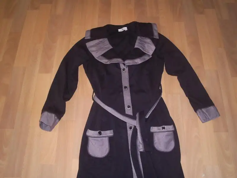 trençkot lacıvert siyah renkte koyu kahverengi olabilir keten veya yağmurluk türünden olabilir .çok süslü değil normal çift düğmeli uzunluğu diz üstünde biten türden44 beden .ölçü isteyecem