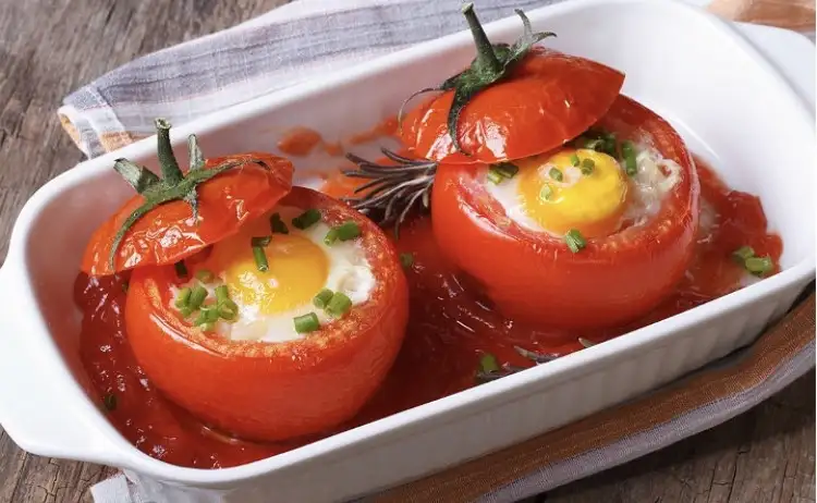 6. Domates sosunu ilave ettiğiniz yumurtalı domates dolmalarını önceden ısıtılmış 200 derece fırında 10 dakika kadar pişirin.