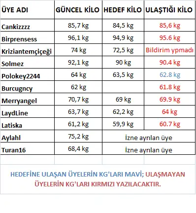 Selam hanımlar. Cuma hedefi listemizi hazırladım. Hedefine ulaşan polokey2244 polokey2244 i bolca tebrik ediyorum:KK9::KK36: Evet gördüğünüz üzere hedefine sadece 1 kişi ulaştı. Bu haftanın geçtiğimiz haftadan çok daha güzel ve bol eksili olmasını diliyorum hepimiz adına. LAydLiNe LAydLiNe Kaptanım sende bırak hedefine ulaşmayı birde artı kilo almışsın o birinciliğide sana takdim ediyorum:sampiyon: Oh mezun mezun al kiloları:KK70: Bu hafta herkesin; bende dahil ulaşabilecek hedefler koymasını diliyorum:p Birde biliyorsunuz ki bu hafta şehir dışında olacağım için yeni haftanın hedeflerini hazırlayamacağım. Hazırlayabiecek arkadaş gruba hedef bildirimlerini bana atın derse ona atarız. Şimdiden teşekkürler:KK19: