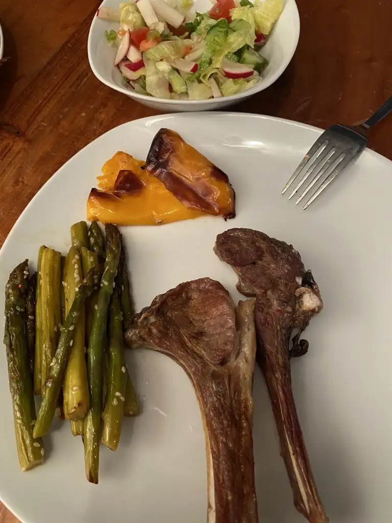 2.5 kepçe göceli (yarma) yoğurt çorbası, 2 adet islim kebabı, 4 küçük fırın patates (orta boy 1 bütün patates kadar diyim), yeşil salata, 1 bardak ayran