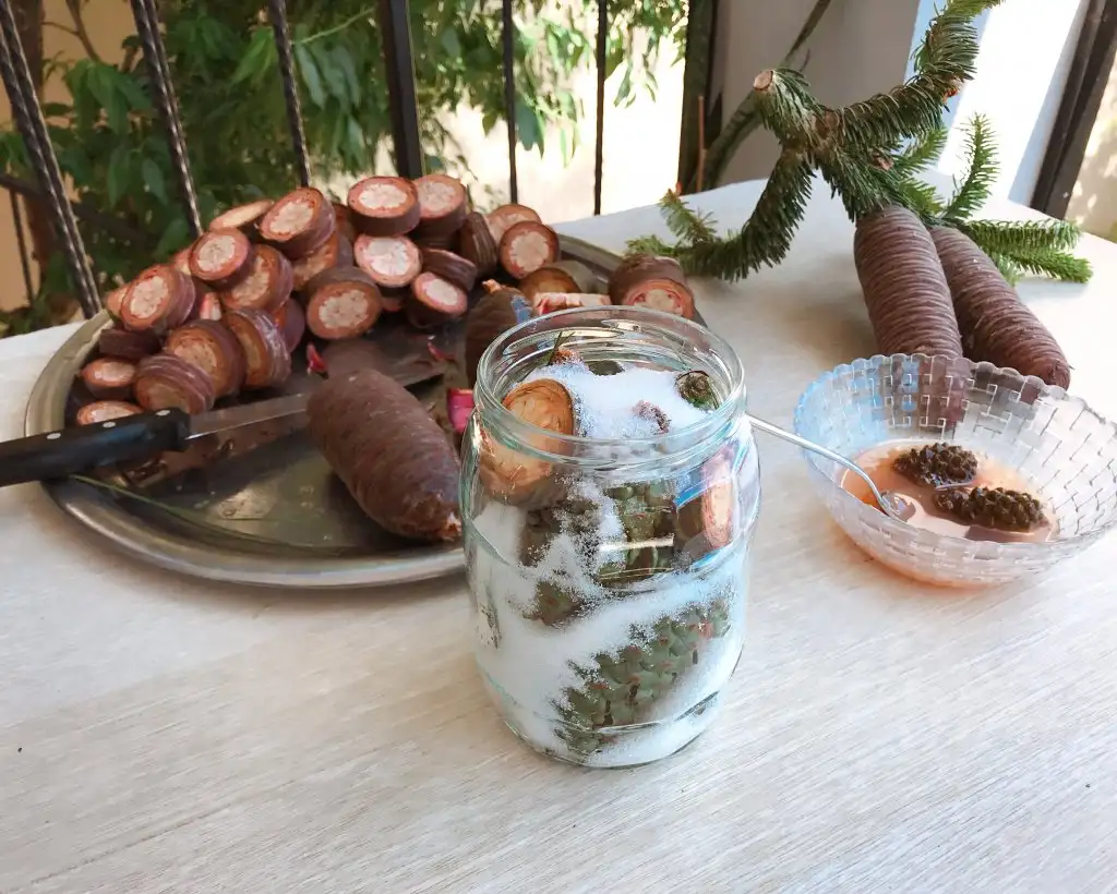 Kızlar fikir olsun kozalak şurubu ve reçeli yapıyoruz. Şifa niyetine. Kışın birer çay kaşığı yenirse bağışıklık sistemine iyiymiş.