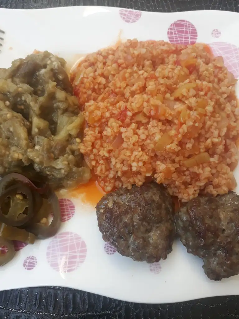Bir ufak kase bulgur pilavi yarim firin patates iki kucuk tavuk pirzola firinda. Bir buyuk tabak coban salata