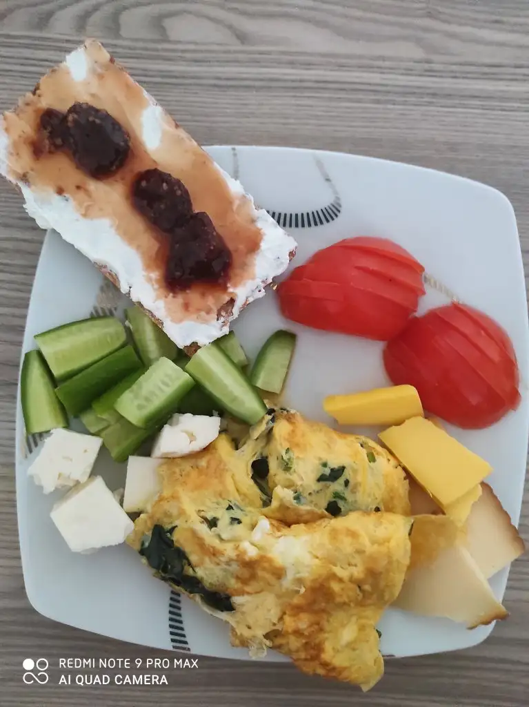 1tb undan krep omlet ..maydanoz peynr mantar zeytinli..salatalık..1tatli kaşığı keçiboynuzu pekmezi.