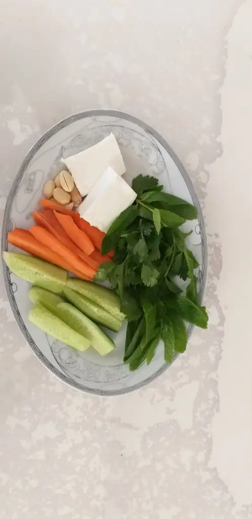 2 tane göz yum, 3 zeytin, bir parça teneke peyniri, 3 ceviz bol yeşillik, çok az muz
