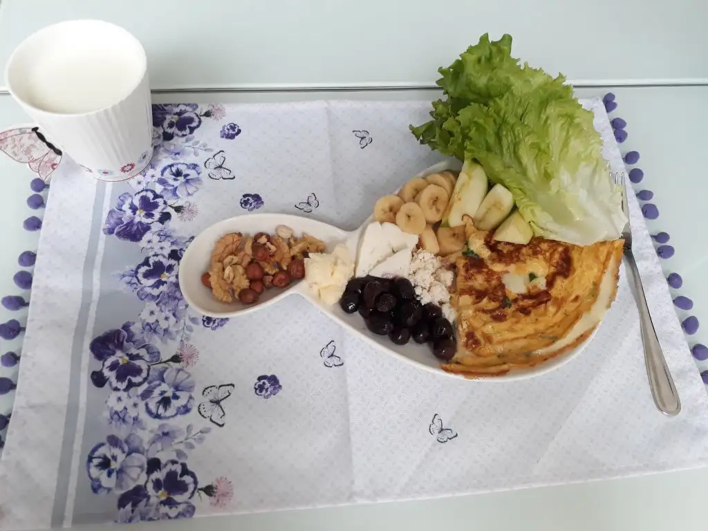 Sabah: menemen, peynir, zeytin, salatalık, yeşil ve kırmızı biber (çiğ)