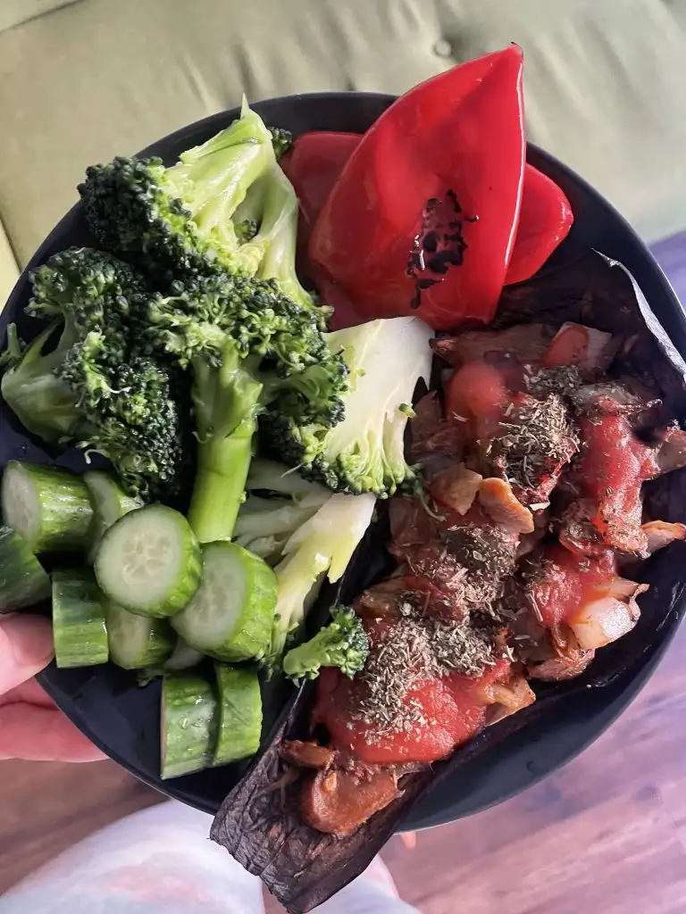 aksam son ogunum: 18:00 de vejeteryan imam bayildi + brokoli haslama + 2 koz kirmizi biber + 1 salatalik+ 4 yk yogurt ve soda