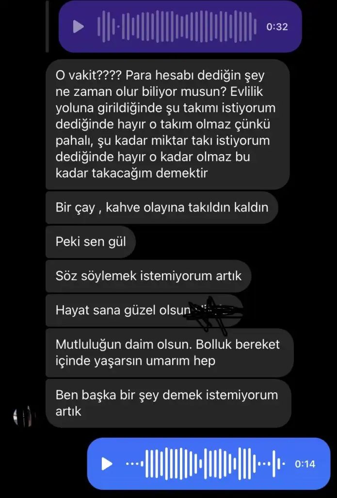 Adamı eleştiriyorsunuz ama sizde az değilsiniz.görmemişler gibi bir haliniz var.neden nişan attınız bilmiyorum ama nisanliniz ,siz ve para arasindaki iliskiden bitirmiş olabilir gibi.İlk buluşmada nargile ve çay içti, ben de 3-4 çeşit içecek içtim. 150 tl hesap geldi ( bence hiç bir şey) bu kasaya gitti direkt, ödedi. Öderken çocuğa bu hesap ne lan demişti . Arkadaşı diye şaka sanmıştım. Gülmüştüm meğer ciddiymiş