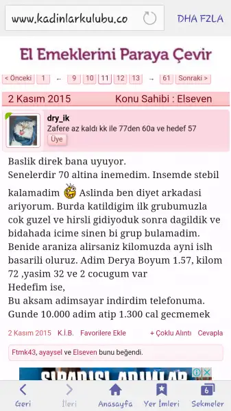 Slm bence sen vucudunda demir vitamin değerlerine baktı onlar eksikse kilo verilmiyor ama şu büyük problem şu olmadan hiç bir diyet çözüm olmaz tm anlamıyla ben yılar önce 65 kiloya indim 4 yıl önceydi 5 yıl önceydi bir yıl sonra geri aldım 80 ler geldim sonra biryilda öyle ne aşağı ne yukarı gitik sonra kızıma 82 kilo ile hamile kaldım 93 kiloyla doğuma girdi ikinci sezaryanimi oldum çok kısa sürede 82 ye indim kızım 21 aylik hayla bu kilo dayım ortalama 4 yıldır bu civarda inmiyor bazen yükselişe geçiyor ne yaptıysam 80 nin altına düşmedim geçenlerde test yaptım demir vitamin kan alt seviyede şuan tedavi görüyor umarım faydası olur ama vazgeçmek istemiyomYa hiç giremez oldum buraya. kilo verememek o kadar çok sıkıyor ki canımı. alt tarafı bir haftadır bıraktım ve abartmadim o halde az önce çıktım 66 gördüm. 4 gün önce 63 tüm. bir insan bir anda 3 kilo alabilir mi. su zaten içebilen biri değilim okulda içsem zorlasam bu defa sürekli wc ye gitmem gerecek. ben tenefuslerde bile öğrenci ile ilgileniyorum zaman kaybı gibi geliyor diğer şeyler. merkezde olsam iyi bir hastanede tahlil yapar diyetisyene giderim. burda var mı yarın bir öğrenmek istiyorum. canım o kadar çok sıkılıyor ki ilk kez böyle bir şey yaşıyorum yazın aylarca bir şey yemedim eşim şahit oldu ama gram gitmedi. şimdi ne yapacağımı bilemiyorum. ayça kayanın listelerine mi baksam diyorum yoksa bıraksam mi düşünmeyi şaşırdım kaldım . moral sıfır kendimi çok çirkin hissediyorum. ne bir elbise almak istiyorum nede dışarıya çıkmak. spor salonuna gitmek istiyorum eşim co illa ilgilenemem zaten çok yorgun geliyorum ben diyor . yürüyus yapmak için alan yok. yürüyüş bandı veya diğer aletlerden alsam hem evim küçük yer yok hem kızım çok yaramaz kendine zarar verebilir durmaz. leslie yaparken bile oyuna çevirip durduruyor beni . offf karmakarisigim cümlelerim gibi. gidip uyuyacsktim moralim bozuldu