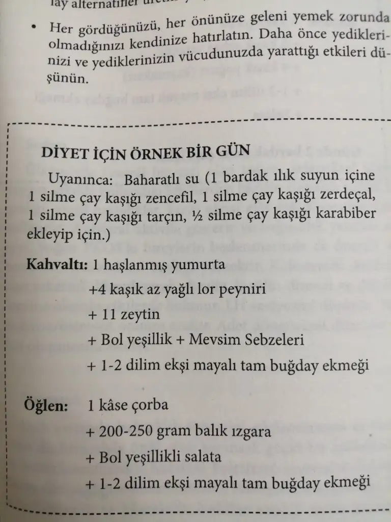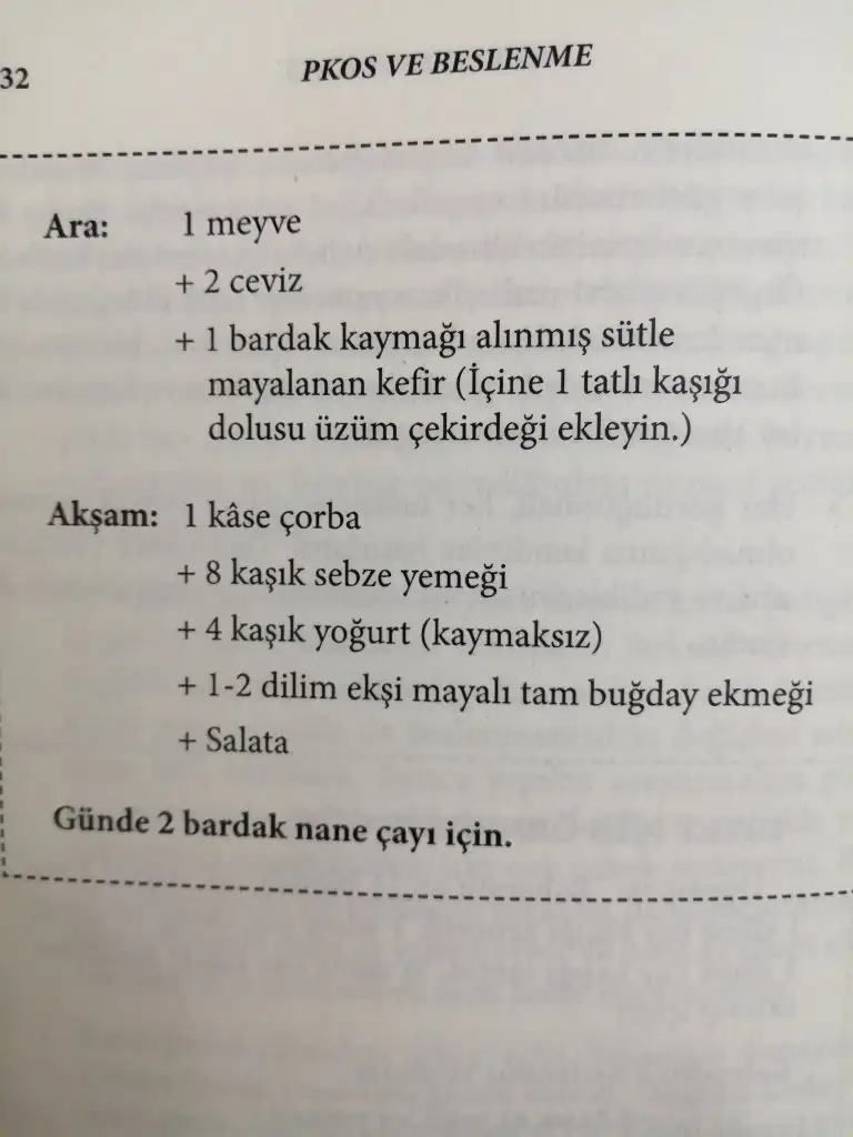 Aynen canım bende pkos ve beslenme kitabı var orada örnek diyet listesi var onu paylaşayım. Tabiki diyetisyenler hep diyetin kişiden kişiye göre değişebileceğini söylüyor. Ama örnek olarak paylaşmış bende birebir yapmıyorum ama yasak olanlardan uzak durup yememiz gerekenleri yersek inşallah o iş tamamSınırı biz ayarlıyoruz aslında.