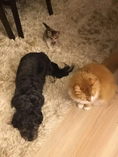 Köpekle kedi kadrolu. Biri 10,biri 4 yaşında. Diğer bebeği sokaktan bulup biberonla besleyip,azcık palazlandırıp yuvalandırdım. Kış boyunca yapıyorum böyle ben..Bu kış da 8 bebek yuva buldu.. Kışın doğanlar soğuğa dayanamıyorlar.. Bulup bulup eve getiriyorum ben de:)Oyy o miniko nerden çıktıhepsininin patilerini dişlerim