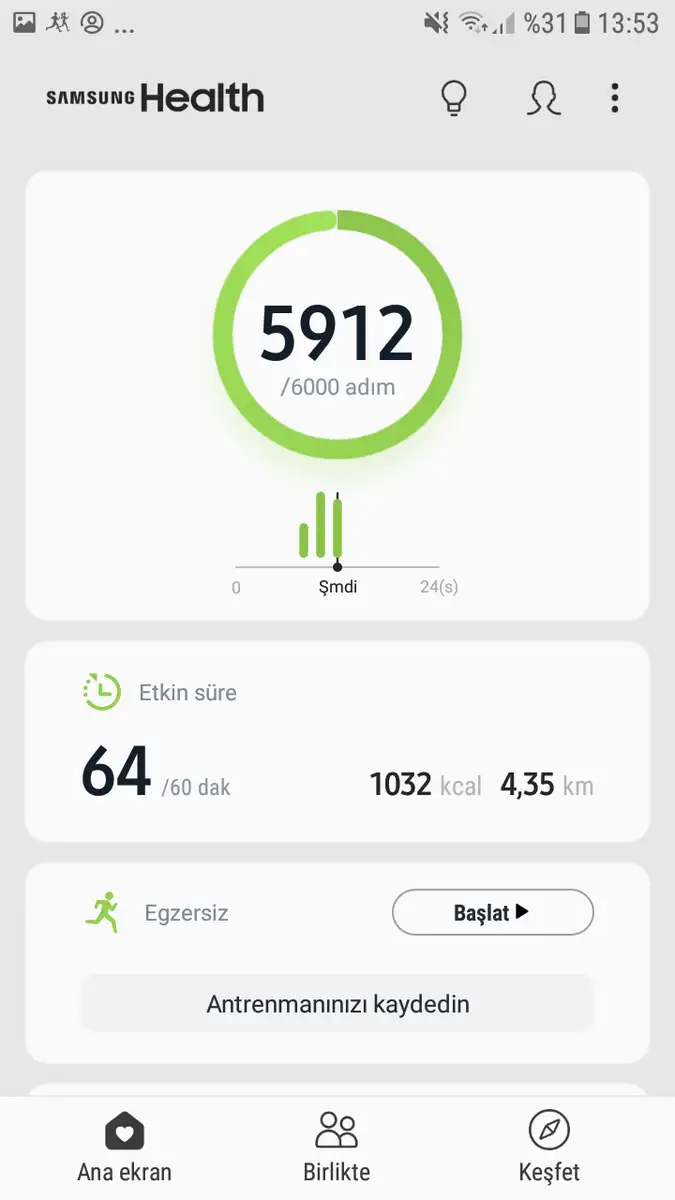 Oyyy cok ugrasmissij canim cocuklar zaten heo byle zamnlarda huysuzlanir tursu tursu jngun ekstra 1 litre su icmen lazm cnm su tutarSabah 9 da 1 haslanmisyumurta 1 bardak cay 15:30 1 tabak patates 2 dilim peyni cok az lahana tursu 20:00 aksam 5 kucuk kofte kara bugday ev yapimi ketcap Su bogazim agriyor su 1 litre bile icemedim Spor: camisir makinam bozuldu cok fazla camasir bidikmisdi yukardan merdiven cik in 20 kova su tasidim sonra 20 metre mesafeye sulu sulu agir bir sekile az az tasiyip durulayip 30 metre uzakdaki ipe asmaya gofurdum. Ondan sonra gelip 1 cam sildim toz aldim bulasik yikadim yemek yapdin kolfuklari cekdim vs kisaca ev isi. Ce bunlari yalarke bu gun kizlar cok huysuzdular bir yandan onlarla iygilendi. Adim 6920 adim yaziliyor ama gunun 3/1 telefonum uzerimde degildi o sirada 2000 adim daha atmisimdir