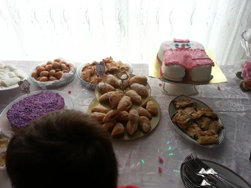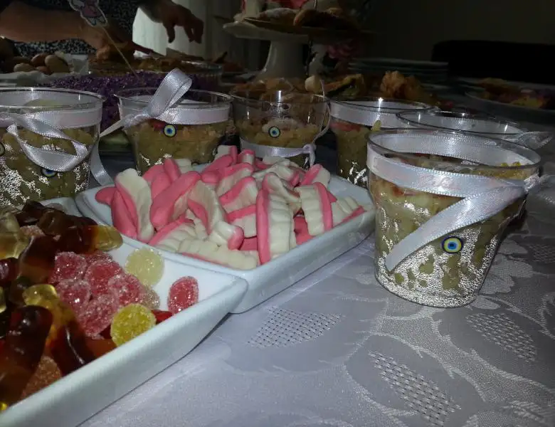 sonra kafasından buğday taneleri attık şekerle birlikte buda kısmetli tatlı bir ömrü olsun kalan dişleri sağlam çıksın diye yapılıyor. arkasından yemeklerimizi yedik sohbet muhabbet ve sonrasında göbek attık.