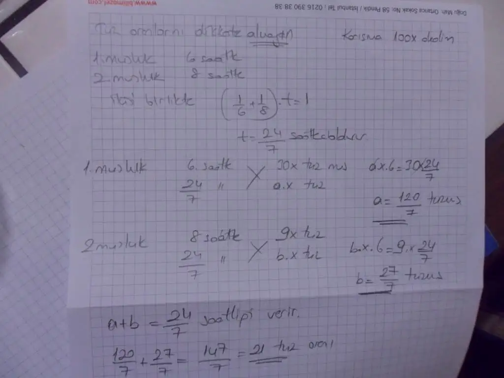 tamam da ben de 24/7 yi buldum ama bir musluğun verdiği tuz oranı saate göre değişmez ki. Yani 6 saatte 1. musluktan akan suyun tuz oranı ne ise 24/7 saatte akıttığı suyun tuz oranı da yine % 30 olmaz mı