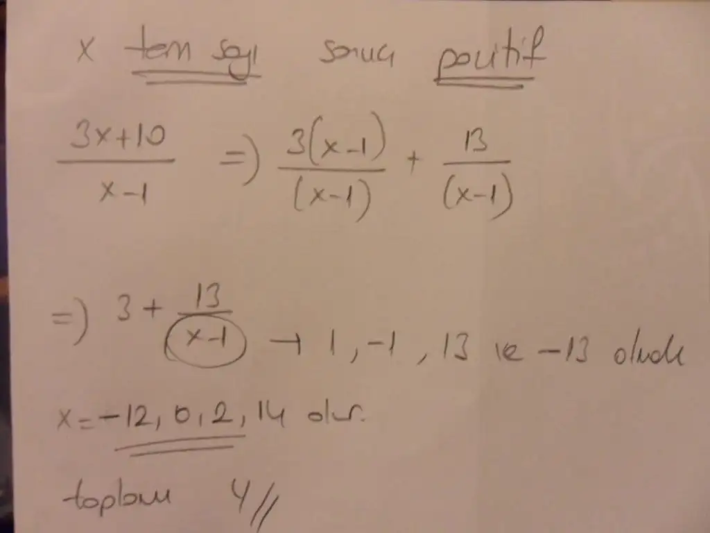 x bir tam sayı olmak üzere, (3x+10) / (x-1) ifadesi pozitif bir tam sayıya eşit olduğuna göre x'in alabileceği değerler toplamı?