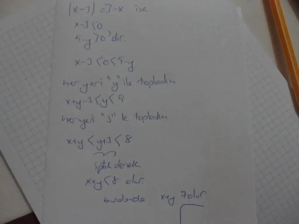 negatif olarak çıkardığımızda eksiyle çarpıyoruz.neg olması için 3 den küçük bir sayı olmalı.gene aynı mantıkla içi pozitif olan olduğu gibi çıkar yani y<5 olmalı.alt alta topla ve bitti :)