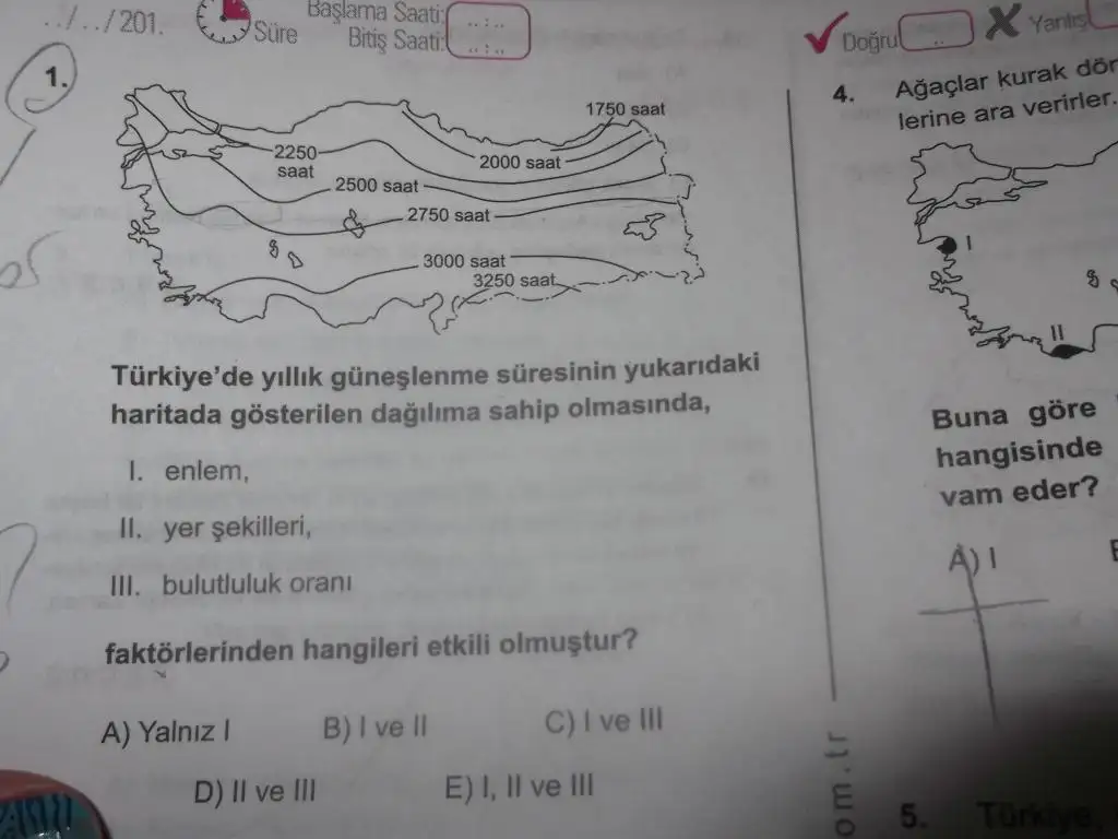 sedef corafya sorusu 1 ve 3 sanırım, enleme göre baktım saatler güneyden kuzeye azalıyor o cepte, birde bulutluluk oranına baktım o da güneşlenme süresiyle ters orantılı en çok bulutnama karadenizde en az akdenizde, ama yer şekilleriyle alakası yok, cevap inşallah 1 ve 3tür ya bunalımlara giricem yoksa