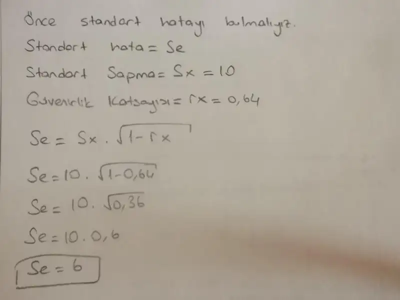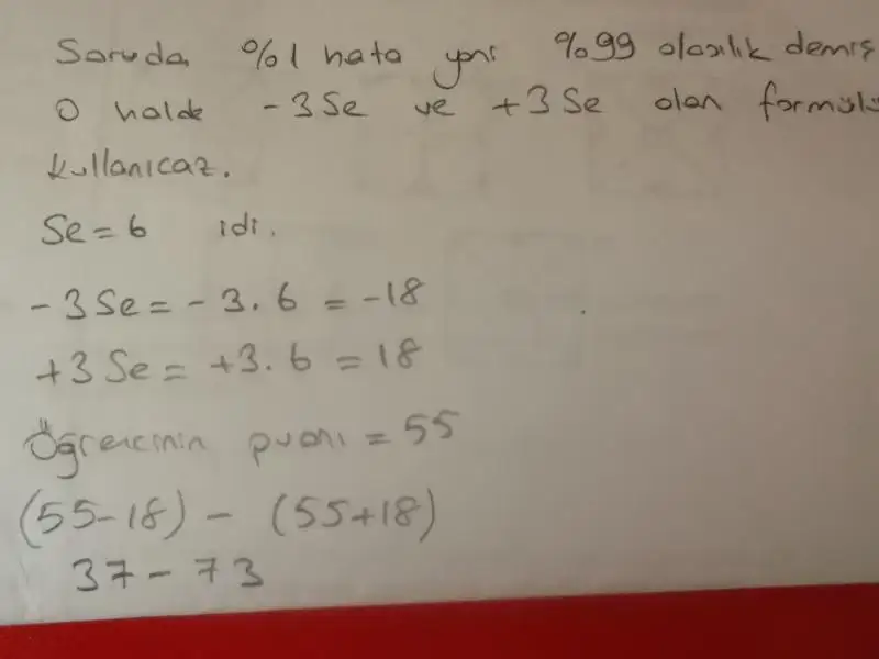 bir testin standart sapması 10 gvenilirlik katsayısı 0.64 tr.bu testten 55 puan alan bir oğrencinin %1 hata payı ile yani %99 olasılıkla gerçek puan aralığı hangisidir?