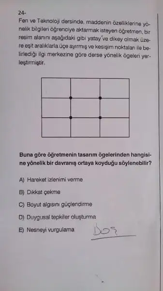 2) Boyut ögesini dikkate alarak bir görsel öğretim materyali tasarlamayı düşünen öğretmenin aşağıdakilerden hangisine öncelikle özen göstermesi gerekir?