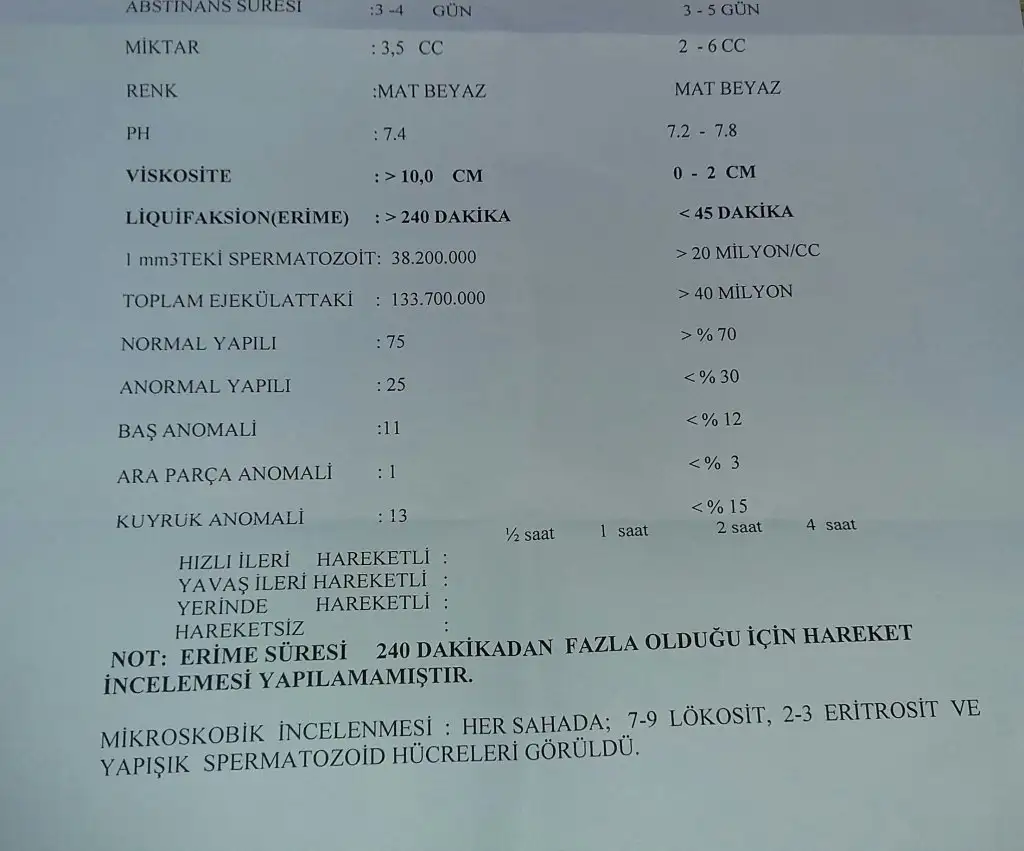 şu baş anomalı kuyruk falan olan bölüm morfolojiyi gösteriyo onlar gayet iyi gözüküyor da hareketlere bakılmamış ...sayı şu 38 milyon olan ama düşük değil labaratuar kriterlerine göre yüksek gözüküyo bu kriterler labaratuardan labaratuara değişiyo