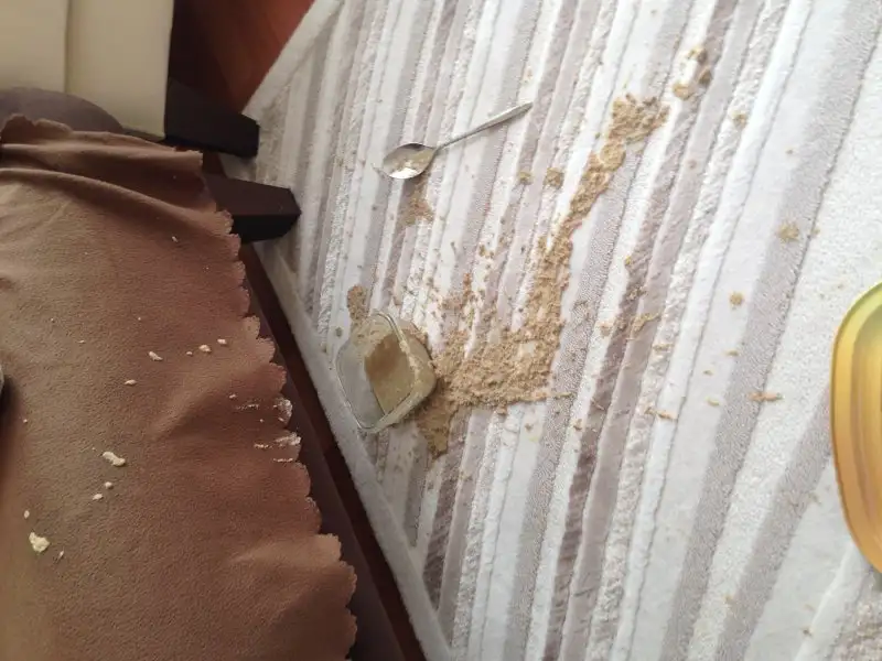 Gökçe hanımın marifeti. Tepsiyi koyup mutfağa küçük kaşık almaya gittim. 10 sn den daha fazla sürmüş olamaz heralde. Yerdeki poları yıkadığım günü bulmuş küçük hanım dökecek. Duvara kadar nasıl sıçrattı hiç anlamadım.