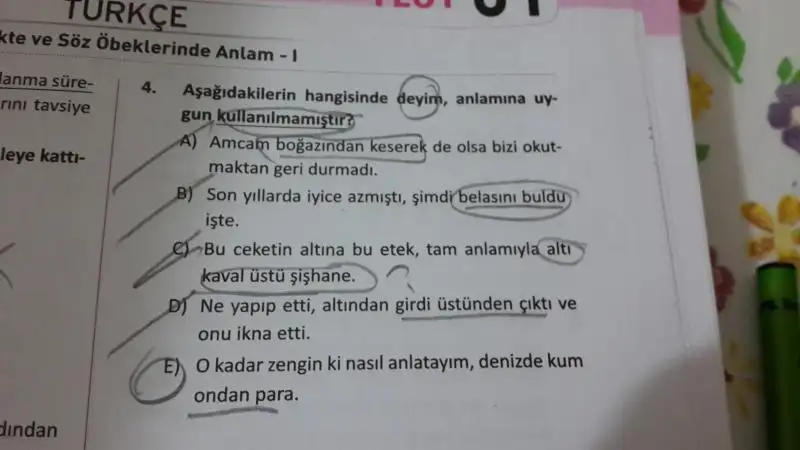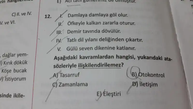 Canim ilk soru d sikki dogru. Ama digeri e sikki. Damlaya damlaya gol olur tasarrufa girer de. Ben otokontrol dediydim. Onu pekistiremedim.elifm deyimlerde cvp muhtemelen ALTINDAN GİRDİ USTUNDEN CIKTI olması lazm çünkü o deyim olumsuz ifadeler icin kullanlılır ama bur da olumlu bi ifade için kullanılmış ve yanlış olmuş..kullanımı için ornek verym daha iyi anlarsn örneğin:elindeki paranın altından girdi ustunden cıktı yani çarçur etti gbi..senin cumlende olması gereken deyim agzından girip burnundan çıkmak olmalıydı yani ikna etmek anlamına geliyor cnm..
