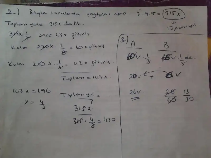 2-bir otomobil gideceği yolun önce 1/7sini , sonra kalan yolun 2/9unu, daha sonrada kalan yolun 1/5ini gidiyor. Toplam 196 km yol giden bu otomobilin gitmesi gereken yol kaç kmdir ? (420 )