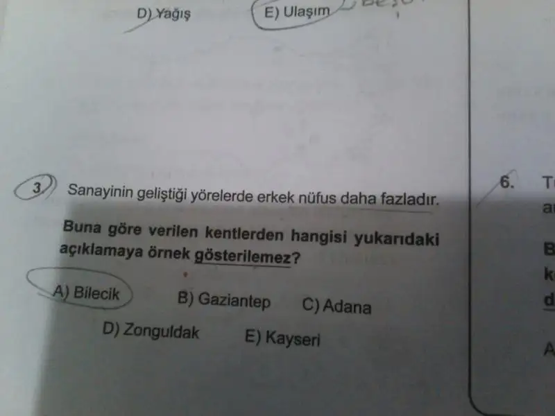 -kuzum sanayinin geliştiği yerler göç alır dolayısıyla erkek sayısı fazlalaşır. diğer şıklar kendi bölgelerine göre sanayisi gelişmiş iller. ama marmara da sanayisi gelişen illerde bilecik yok..